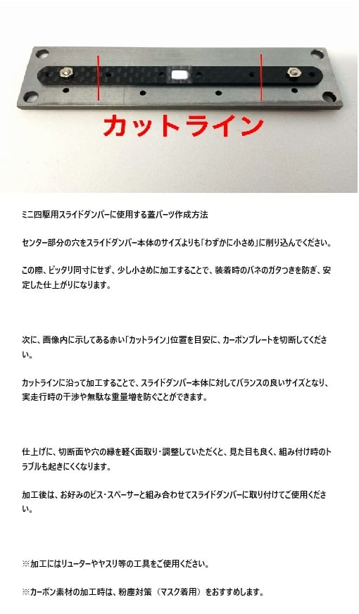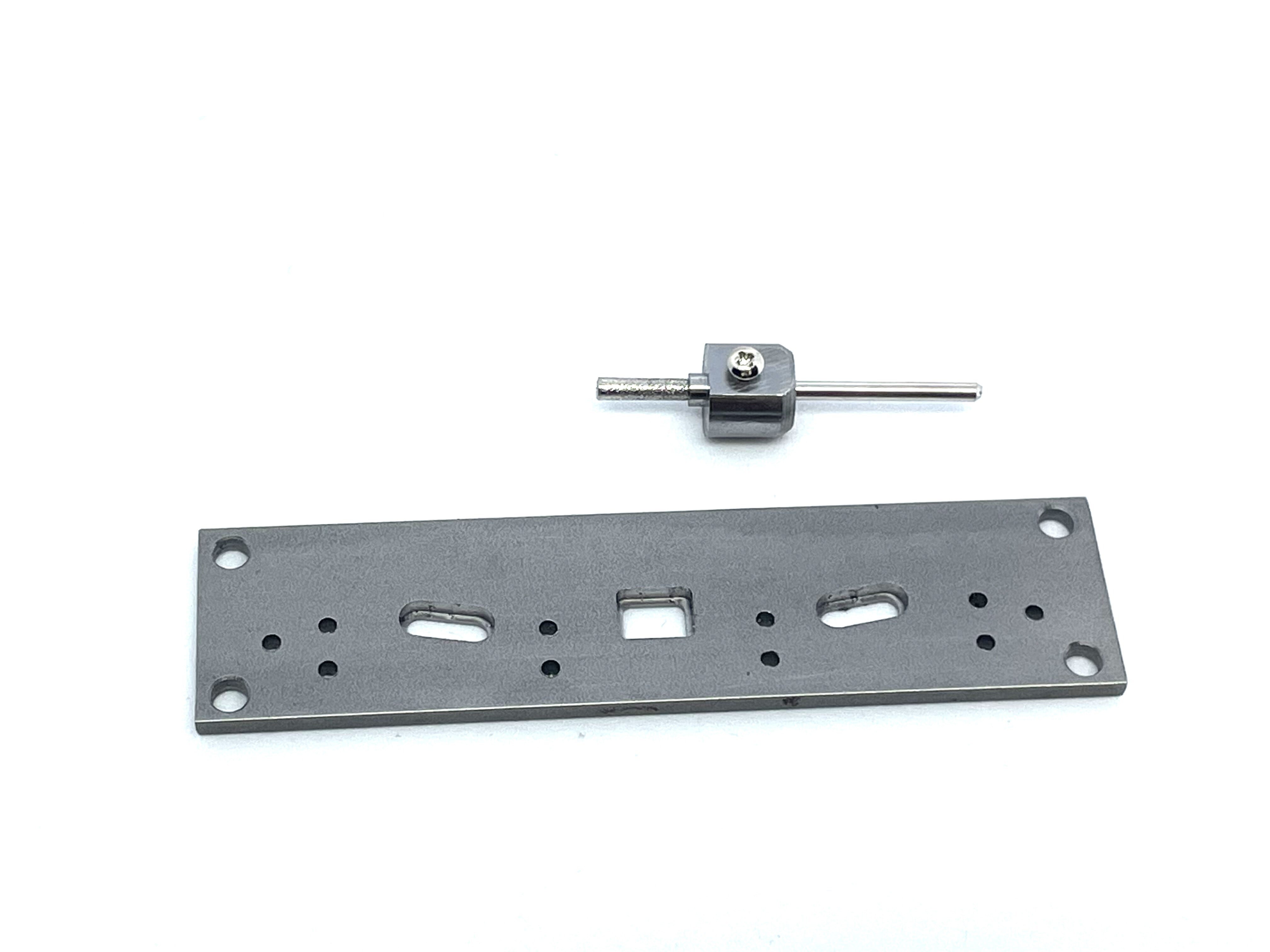 真鍮パイプが入る様拡張、仕上げをする治具となります。 カーボン装着後先のとがったヤスリでケガキ加工をし、カーボンを取り外し粗削りをしてから再度プレートに装着して下さい。 仕上げはダイヤバー+ストッパーを使用しフラットになるまで加工してください。 ダイヤバーにカーボンがついた場合硬めの歯ブラシなどで擦ると綺麗になります。